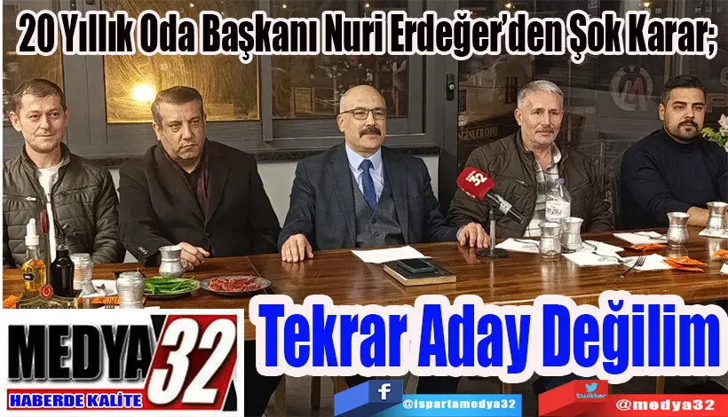 20 Yıldır Isparta Lokantacılar, Fırıncılar, Kasaplar ve Pastacılar Odası Başkanlığını yapan Nuri Erdeğer, düzenlediği basın toplantısıyla gelecek ay yapılacak seçimlerde yeniden aday olmayacağını açıkladı.