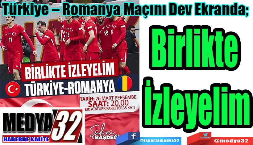 A Milli Futbol Takımımız 2026 FİFA Dünya Kupası Elememeleri play-off turu yarı final maçında Romanya ile karşılaşacak. Maç 26 Mart Perşembe günü saat 20.00’da başlayacak. Isparta Belediyesi, A Milli Futbol Takımımızın bu önemli maçı için Atatürk Parkı teras katına dev ekran kuracak. Sporseverler omuz omuza hep birlikte milli heyecanı dev ekranda yaşayacak.