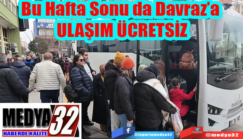 Isparta Belediyesi, okulların sömestr tatiline girmesiyle birlikte çocukların ve ailelerinin tatili daha verimli ve keyifli geçirebilmesi amacıyla Davraz Kayak Merkezi’ne geçen hafta sonu başlattığı ücretsiz otobüs seferlerine bu hafta sonu da devam ediyor. 24 Ocak Cumartesi ve 25 Ocak Pazar günleri Davraz’a gitmek isteyen vatandaşlar ücretsiz otobüs hizmetinden yararlanabilir.