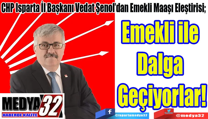 CHP Isparta İl Başkanı Vedat Şenol, emekli maaşlarına yapılan zammın çok komik ve düşük olduğunu belirterek; “Bu iktidar emeklilerle resmen dalga geçiyor. En düşük emekli maaşı en az asgari ücret seviyesine yükseltilmeliydi” dedi.