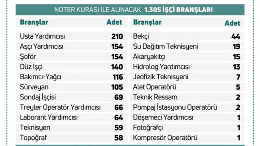 Devlet Su İşleri Genel Müdürlüğü (DSİ), taşra teşkilatında görev yapacak toplam 1.389 personel alımı gerçekleştireceğini duyurdu. Tarım ve Orman Bakanı İbrahim Yumaklı tarafından paylaşılan bilgiye göre, alımların büyük çoğunluğu noter kurası yoluyla, bir kısmı ise yazılı, sözlü ve uygulama sınavı ile yapılacak. Noter kurası dışında kalan 84 kadro ise Operatör pozisyonu için açıldı. Bu pozisyonlara başvuracak adaylar, yazılı, sözlü ve uygulama sınavına tabi tutulacak.