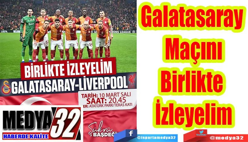 Isparta Belediye Başkanı Şükrü Başdeğirmen, Galatasaray-Liverpool maçını izlemek için tüm vatandaşları Atatürk Parkı teras katına davet etti. Başkan Başdeğirmen, “Temsilcimiz Galatasaray’ın, Liverpool karşısında sahaya çıkacağı bu büyük mücadeleyi ay yıldızlı bayrağımızın gölgesinde, tek yürek halinde birlikte izliyoruz. Futbolun heyecanını, coşkusunu ve birlik ruhunu hep birlikte yaşamak için 10 Mart Salı günü saat 20.45’te Atatürk Parkı Teras Katı’nda buluşuyor, takımımızı omuz omuza destek veriyoruz. Tüm hemşehrilerimiz davetlidir” dedi.
