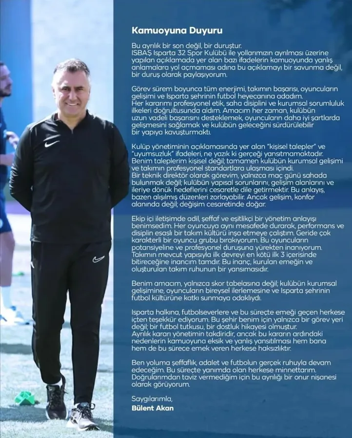 Akan, açıklamasının sonunda Isparta halkına, futbolseverlere ve süreçte emeği geçen herkese teşekkür etti. “Bu şehir benim için yalnızca bir görev yeri değil; bir futbol tutkusu, bir direniş hikayesidir. Doğrularımdan taviz vermediğim için bu ayrılığı bir onur nişanesi olarak görüyorum” dedi.