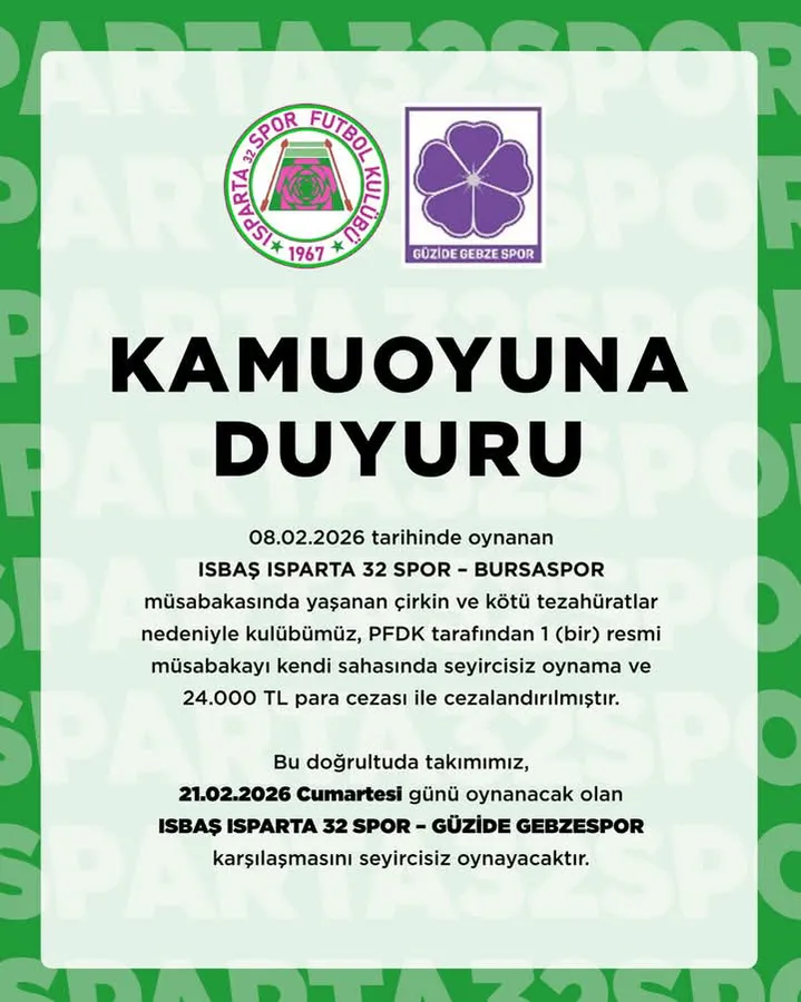 Bu doğrultuda; Türkiye Futbol Federasyonu (TFF) Profesyonel Futbol Disiplin Kurulu’nun Ispartaspor’a verdiği 1 maçlık SEYİRCİSİZ OYNAMA cezası takımın bu hafta sonu yani 21 Şubat Cumartesi günün Isparta Atatürk Stadında oynanacak olan Ispartaspor – Gebzespor maçında icra edilecek. Yeşil – Pembeliler o maçta Taraftarlarından mahrum kalacak.