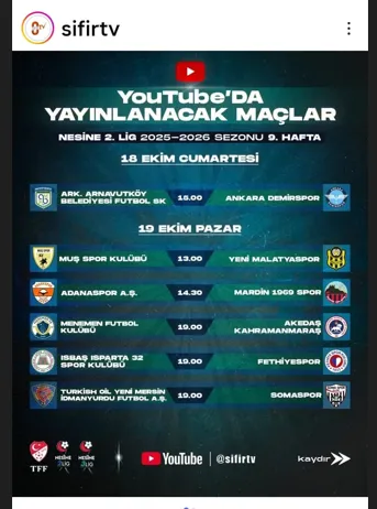 2. Lig ve 3. Lig maçlarının naklen yayın hakkını alan Bi Kanal işe hızlı başladı. Kanal, gerek bizzat kendi ismiyle yani Bİ TV olarak gerekse kendisine bağlı olan Sıfır TV Youtube kanalından 2. Ligdeki tüm maçları naklen yayınlıyor. Bu doğrultuda, 19 Ekim Pazar günü yani bu akşam saat 19.00’da Isparta Atatürk Stadyumunda oynanacak olan Ispartaspor – Fethiyespor maçı Sıfır TV Youtube Kanalından naklen yayınlanacak.