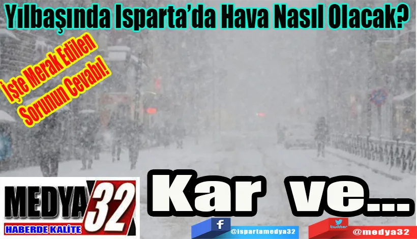 Isparta halkı tarafından merak edilen ‘Isparta’da Yılbaşında hava durumu nasıl olacak?" sorusu yanıtını buldu. Isparta’da yılbaşı gecesi yani 31 Aralık Çarşamba günü kar yağacak. 1 Ocak Perşembe günü ise hava parçalı az bulutlu ve güneşli olacak. Ancak, hava çok soğuk ve ayaz olacak. Hava sıcaklığı en yüksek eksi 2, en düşük ise eksi 9 derece olarak ölçülecek. Diğer bir deyişle Isparta’da yılın ilk günü günlük güneşlik ancak, çok ayaz olacak.