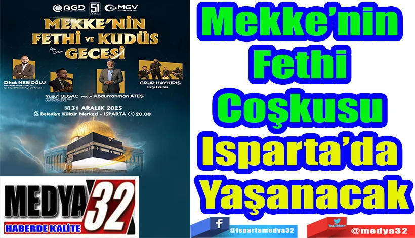 Anadolu Gençlik Derneği (AGD) 31 Aralık akşamı Mekke’nin Fethi’nin 1395. Yıldönümünü kutlayacak. Isparta Meydan AVM Kültür Merkezinde gerçekleştirilecek Anadolu Gençlik Derneği Isparta Şube Başkanı Mustafa Başgül, 31 Aralık Çarşamba akşamı yani bu akşam tüm Isparta halkıhı ailesiyle beraber programa beklediklerini belirtti.