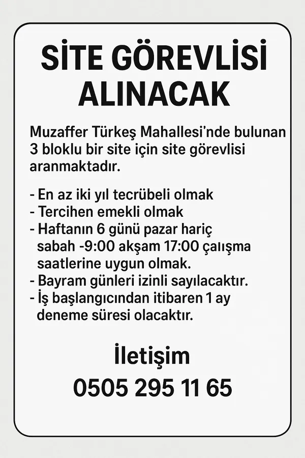 Muzaffer Türkeş Mahallesi’nde bulunan 3 bloklu bir site için site görevlisi aranmaktadır. İstenen şartlar aşağıdadır;