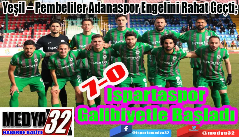 Kendi saha ve seyircisi önünde ikinci yarının ilk maçında rakibi olan Adanaspor takımı ile karşılaşan Ispartaspor, maçlara U19 takımıyla çıkan rakibini rahat geçti: 7 – 0. Bu galibiyetle ikinci yarıya hem üç puan hem de averajı düzelterek ve moralli bir giriş yapan Yeşil – Pembeli ekibin gollerini Uğur Can, Ziya Alkurt (2), Yiğithan Güveli, Ertuğrul Kurtuluş, Kerem Baykuş ve Orkun Kocakahya kaydetti.