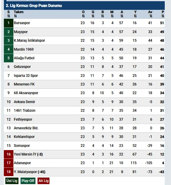 2. LİG KIRMIZI GRUPTA 23. HAFTA PUAN DURUMU: