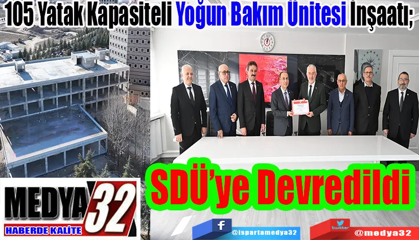 Daha önce Isparta Kent Hizmetlerini Geliştirme Derneği bünyesinde bulunan yoğun bakım ünitesi inşaatı, Isparta Belediye Başkanı Şükrü Başdeğirmen’in Ankara’da gerçekleştirdiği temaslar neticesinde düzenlenen protokolle Süleyman Demirel Üniversitesi’ne devredildi. Düzenlenen devir protokol imza programına Isparta Belediye Başkanı Şükrü Başdeğirmen, SDÜ Rektörü Prof. Dr. Mehmet Saltan, Isparta Ticaret Borsası Başkanı Hüdai Şahin, rektör yardımcıları ve Isparta Kent Hizmetlerini Geliştirme Derneği yönetimi katıldı.