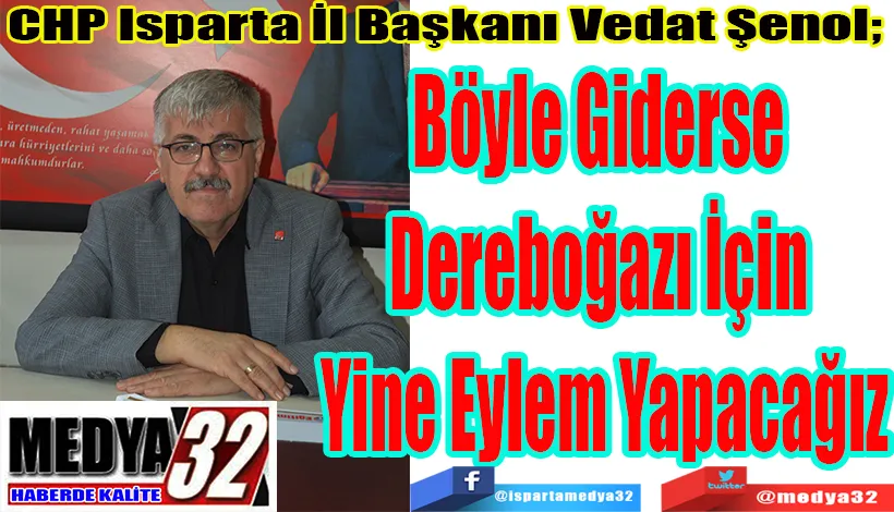 CHP Isparta İl Başkanı Şenol, yılan hikayesine dönen Isparta – Antalya Dereboğazı yolu için ayrılan cüzzi ödeneğe sert tepki göstererek; “Dereboğazı Yolu mutlaka tamamlanmalıdır. Aksi takdirde biz CHP olarak 12 yıl önce yaptığımız Kazma – Kürek eylemini yeniden yapacağız” dedi.
