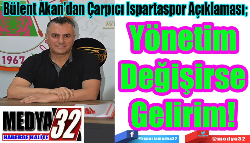 Ispartaspor eski Teknik Direktörü Bülent Akan, üç ay aradan sonra Ispartaspor ile ilgili çok çarpıcı bir açıklama yaparak; “Şuanda takım 38 puanla ilk yarıyı lider bitirecekti. Yönetim değişirse seve seve Isparta’ya gelirim” dedi.