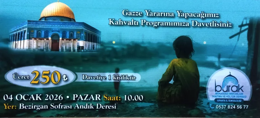 BURAK Derneği Isparta Şubesi Başkanı Ali Çil, konu ile ilgili olarak yaptığı açıklamada; “BURAK Derneği olarak, zulme karşı onurlu bir direniş sergileyen Filistinli kardeşlerimizin yaralarını sarmak, onlara moral ve maddi destek sağlamak amacıyla düzenlediğimiz kahvaltı programımıza tüm halkımız davetlidir. Kahvaltı programımızdan elde edilecek tüm gelir, Filistinli kardeşlerimizin ihtiyaçları için kullanılacaktır” dedi.