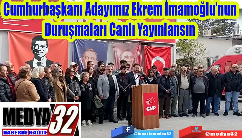CHP Gençlik Kolları Isparta İl Başkanımız Musa Korkmaz, Cumhurbaşkanı Adayları Ekrem İmamoğlu’nun tamamen asılsız iddialarla cezaevinde tutulduğunu ve yargılandığını belirterek; “Ekrem Başkanımızın duruşmaları TRT’den canlı yayınlanmasını istiyoruz” dedi.