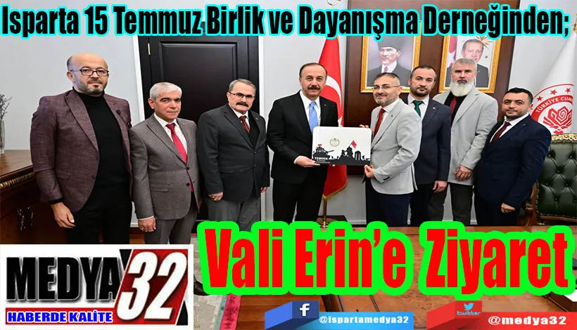 Isparta 15 Temmuz Birlik ve Dayanışma Derneği Başkanı Ramazan Çapan ve Yönetim Kurulu üyeleri Vali Abdullah Erin’i makamında ziyaret ettiler.