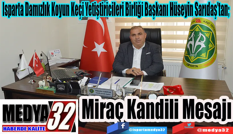 Isparta İli Damızlık Koyun Keçi Yetiştiricileri Birliği Başkanı Hüseyin Sarıdaş, bu akşam idrak edeceğimiz Miraç Kandili nedeniyle bir kutlama mesajı yayınladı.