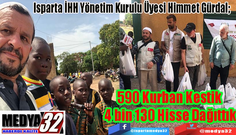 İnsani Yardım Vakfı (İHH) Genel Merkez organizasyonuyla Kurban Bayramında görevli olarak Burkina Faso’ya giden Isparta İHH Yönetim Kurulu Üyesi Himmet Gürdal, Burkina Faso’da 590 kurban kestiklerini belirterek; “Bu kurbanlardan oradaki kardeşlerimize 4 bin 130 hisse dağıttık” dedi.