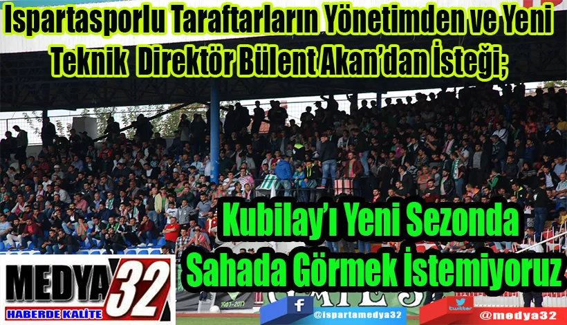 Ispartasporlu Taraftarlar, geçtiğimiz yıl Forvet olarak takıma alınan Kubilay Türkyılmaz’ı yeni sezonda sahada görmek istemediklerini belirterek; “Geçen yıl son derece kötü bir performans sergileyen bu futbolunun yerine etkin ve gol yollarında becerikli bir Santrafor alınmasını istiyoruz” dediler.