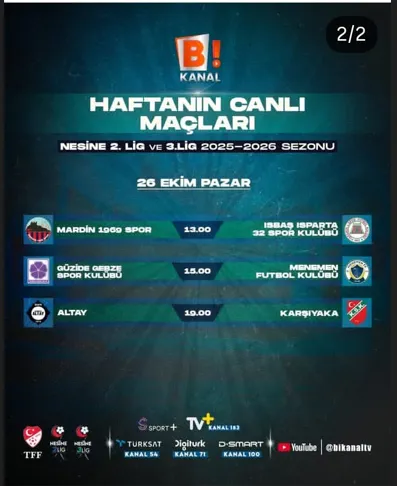 2. Lig ve 3. Lig maçlarının naklen yayın hakkını alan Bi Kanal işe hızlı başladı. Kanal, gerek bizzat kendi ismiyle yani Bİ TV olarak gerekse kendisine bağlı olan Sıfır TV Youtube kanalından 2. Ligdeki tüm maçları naklen yayınlıyor. Bu doğrultuda, Pazar günü gündüz saat 13.00’te Kızıltepe İlçe Stadyumunda oynanacak olan Mardinspor 1969 – Ispartaspor maçı Bi Kanal TV'den naklen yayınlanacak.
