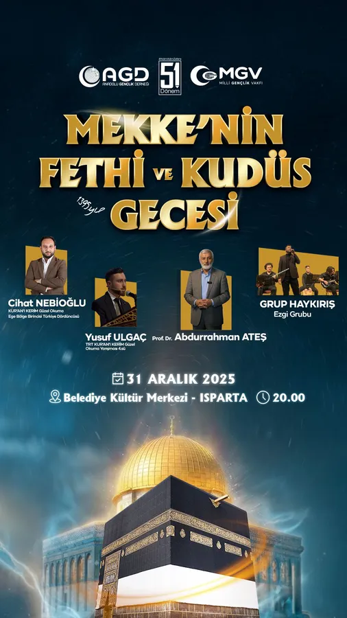 Anadolu Gençlik Derneği Isparta Şubesi, her yıl geleneksel olarak düzenlediği Mekke’nin Fethi Programını bu akşam da gerçekleştirecek. Program bu akşam saat 20.00’de Isparta Meydan AVM Gül Salonunda başlayacak.
