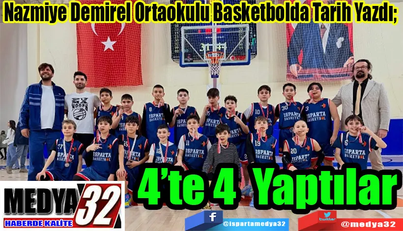 Isparta’da okul sporlarında büyük başarıya imza atan Nazmiye Demirel Ortaokulu, basketbolda adeta tarih yazdı. Küçük Erkekler ve Küçük Kızlar kategorilerinde İl Şampiyonu olan okul, daha önce Yıldız Kızlar ve Yıldız Erkekler kategorilerinde de şampiyonluğa ulaşarak 4’te 4 yaptı ve Isparta basketboluna damga vurdu.