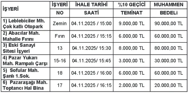 Belediyeden yapılan duyuruya göre, 04 Kasım 2025 Salı günü, belediyede encümen huzurunda yapılacak ihaleye ait şartnamenin her gün mesai saatlerinde Mali Hizmetler Müdürlüğünde görülebileceği kaydedildi. Söz konusu taşınmaz bilgileri, ihale tarih ve saati ile geçici teminat ve muhammen bedelleri şu şekilde: