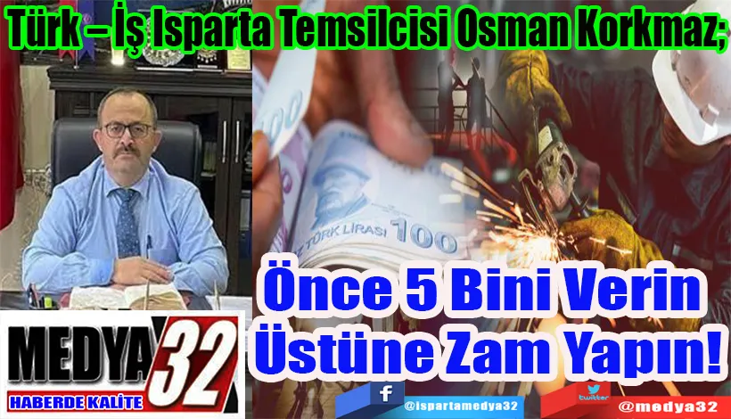 Türkiye İşçi Sendikaları Konfederasyonu (Türk – İş) Isparta İl Temsilcisi Osman Korkmaz, Asgari ücretin enflasyon karşısında adeta eriyip gittiğini belirterek; “Yaşanan bu kaybın telafisi için önce ön ödemeli telafi zammının yapılması gerekiyor. Ön ödemeli zammın ise en az 5 bin lira olması gerekiyor” dedi.