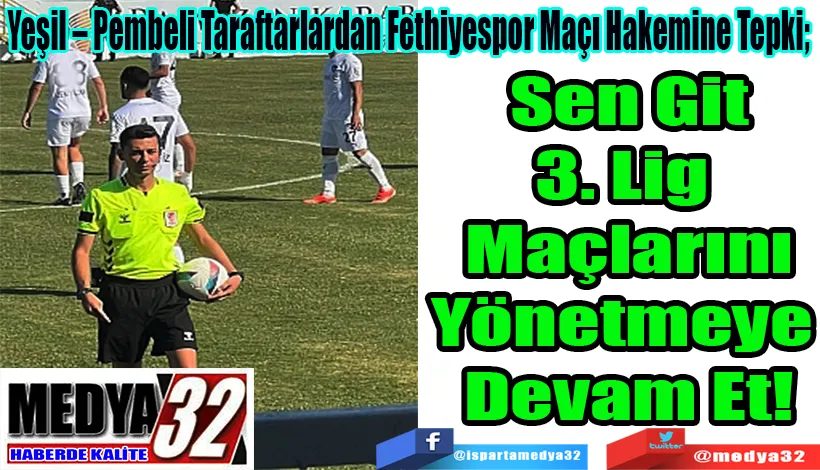 Ispartaspor maçlarına bundan böyle 3. Lig Hakemi istemediklerini ifade eden Yeşil – Pembeli Taraftarlar; “Ispartaspor’un Fethiyespor ile deplasmanda oynadığı maça 3. Lig hakemi Berat Buğra Çelik atandı. Çelik, maçta verdiği tutarsız kararlarla henüz 2. Lig maçlarını yönetecek kapasitede olmadığını apaçık ortaya koydu.