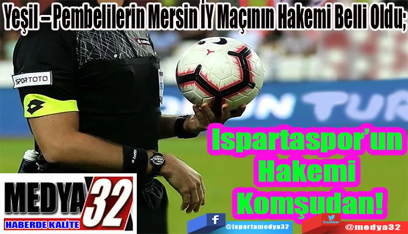 Merkez Hakem Kurulu'nun atamasına göre; Ispartaspor'un bugün deplasmanda Mersin İdyanyurduspor ile oynayacağı maçı Isparta’nın komşusu Antalya Bölgesi Klasman Hakemi İbrahim Güner yönetecek. Hakem İbrahim Güner’in Yardımcılıklarını Denizcan Şahin ve Kaan Kaya yapacak. Müsabakanın dördüncü Hakemi ise Hakan Aktaş olarak belirlendi.